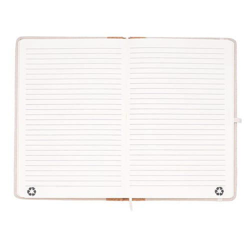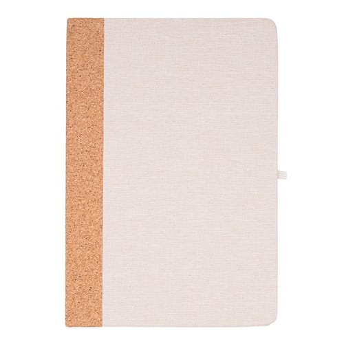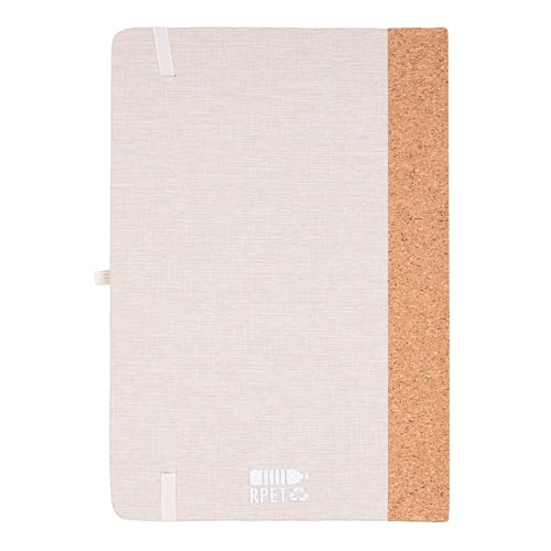 Бележник с корица от RPET полиестер, естествен корков ръб и 80 листа на редове от рециклирана хартия. С отметка, ластик и държач за химикалка. Размер A5.