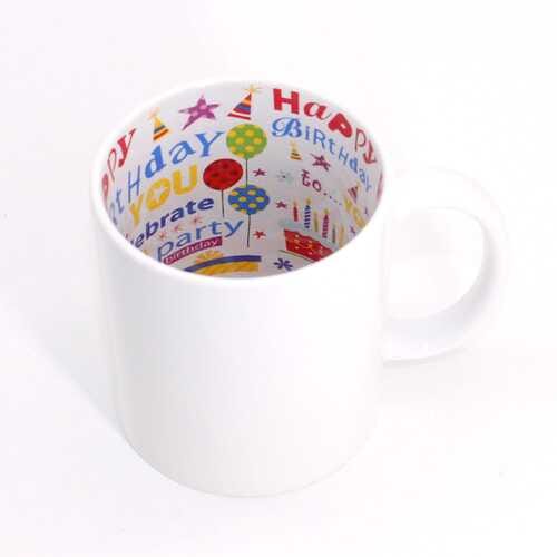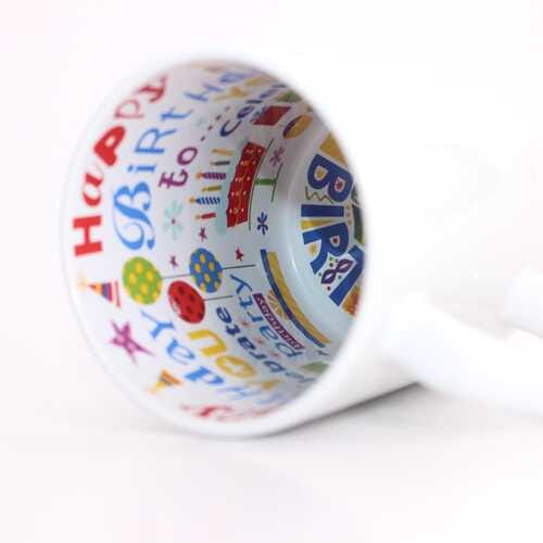 От външната страна чашата е напечатана с красив дизайн и с интересно и различно пожелание за рожден ден, а от вътрешната страна има надпис "Happy Birthday" и красиви цветни тематични илюстрации🎉