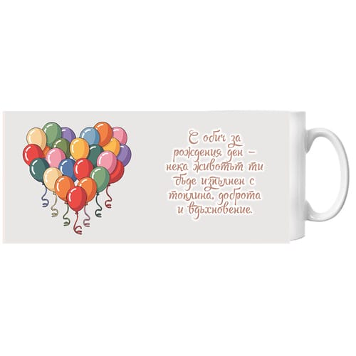 Бяла порцеланова чаша с празничен дизайн, подходяща за подарък за рожден ден.