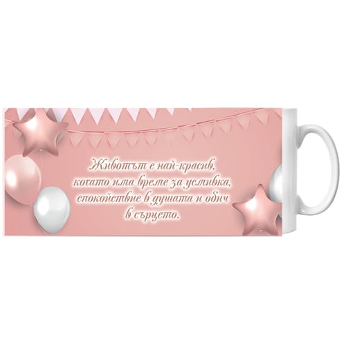 🎂 Чаша за рожден ден с текст "Животът е най-красив..." и надпис "Happy Birthday" отвътре ☕