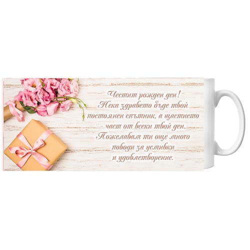 Бяла порцеланова чаша с празничен дизайн, подходяща за подарък за рожден ден.