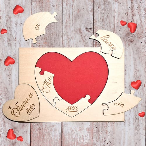 Уникална картичка с изрязан дизайн във формата на сърце, съставено от 6 парчета пъзел – всяко с гравирана дума, които заедно изписват посланието:
