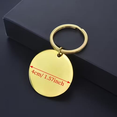 Стилен ключодържател в кръгла форма, изработен от златиста, лъскава, неръждаема стомана.