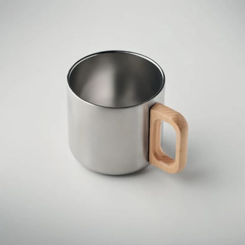 Чаша е мателна с двойна стена от рециклирана неръждаема стомана с дървена дръжка за удобно ползване. Има капацитет от 350 мл и отлично поддържа температурата на напитките благодарение на двойната изолация.
