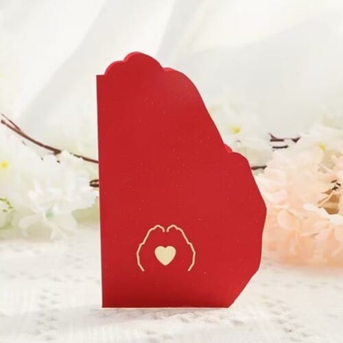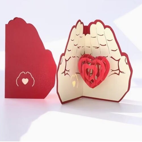 Тази изящна 3D картичка за влюбени е създадена, за да каже „Обичам те“ по най-нежния начин. 🤍 Изработена от луксозен картон в наситено червено, тя впечатлява с формата си на две ръце, които държат сърце – символ на грижа, отдаденост и споделена любов. ✋❤️✋