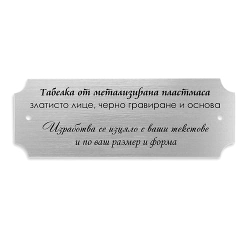 Табелките могат да бъдат изработени в различни размери и форми според вашите изисквания. Текстът или графиката се гравират прецизно, като при гравирането се получава контрастен черен надпис, който осигурява отлична четимост и стилен външен вид.